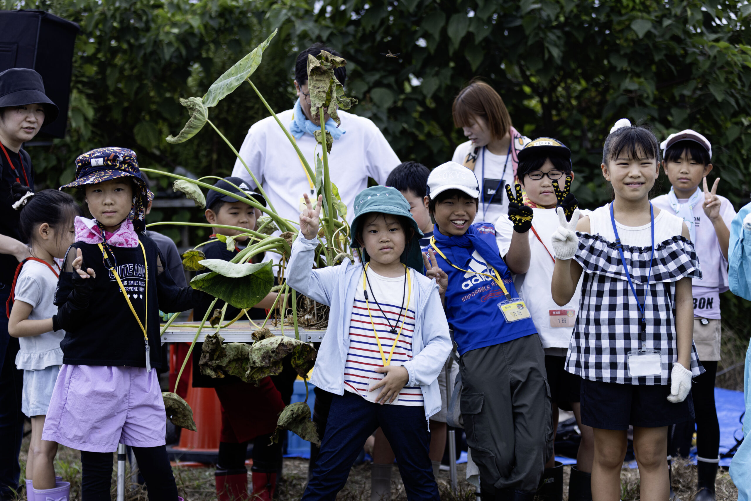 2025年9月23日、愛媛県大洲市 サトイモ栽培ほ場で開催された「オドル野菜プロジェクト」の収穫イベントに、大洲市内の児童・保護者、大洲農業高校生徒が参加し、今年の4月に植えたサトイモの収穫を行いました。